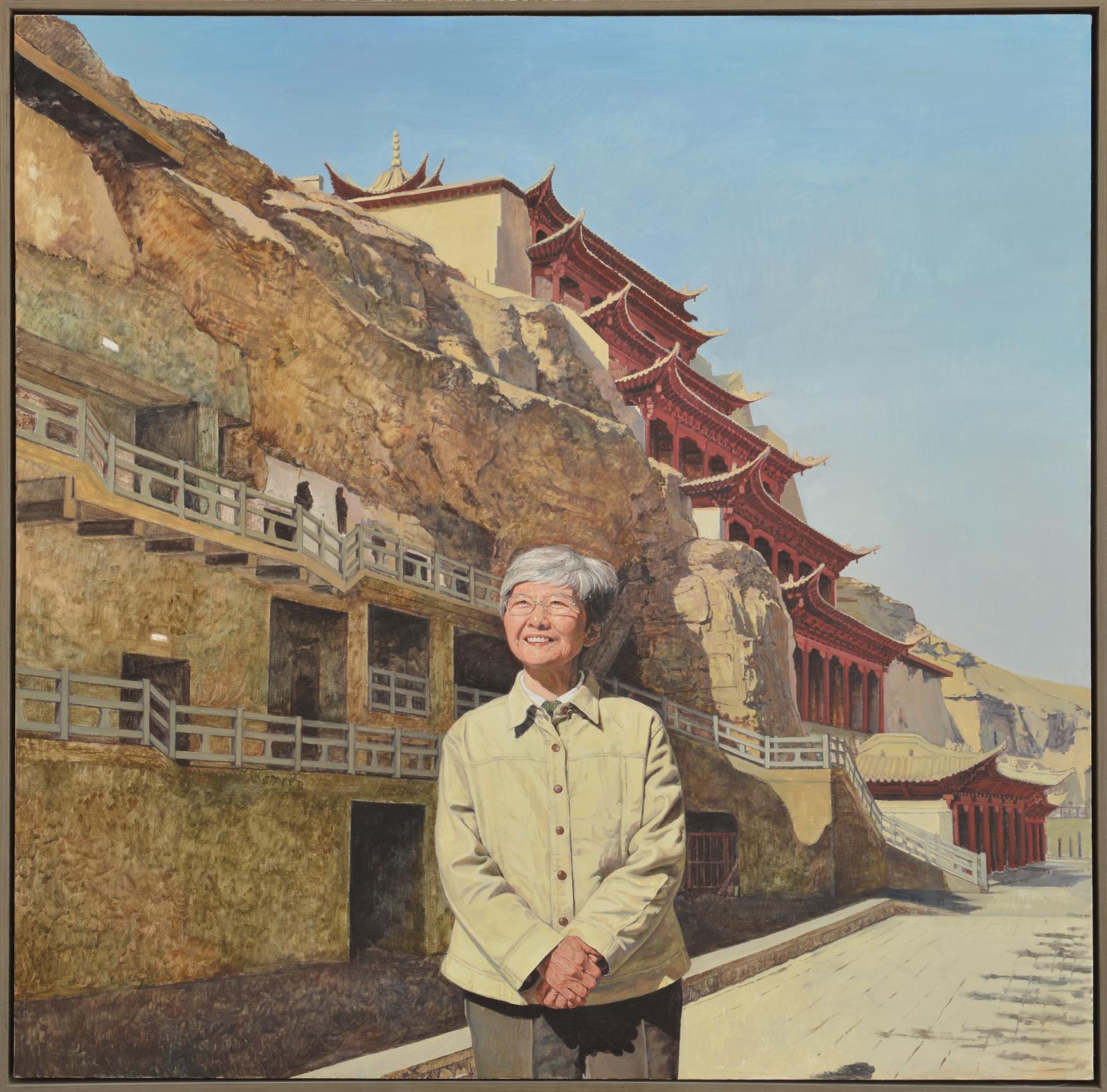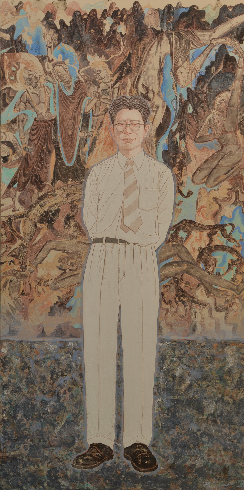 岳阳以莫高窟前辈学者为题材的作品反映了他对老一辈莫高窟人和“莫高精神”的崇敬之情,如作品《敦煌女儿》充分地体现了他的造型语言及对人物刻画的能力,还有他们这一代年轻人对莫高窟老先生的尊重,正如岳阳曾经跟我说过“来到敦煌研究院工作更像是在大学里继续学习的状态。”莫高窟的各位专家也不时地对他们这些年轻人起到了一定的鞭策作用。作品《常书鸿》是他运用传统壁画语言创作的人物画,一是展现了对传统壁画语言的理解和创新,二是体现了常书鸿先生在从事敦煌壁画艺术的美术工作者们心中的位置。这些影响与传承也是几代莫高人为之动容的宝贵财富也是艺术创作中的真情流露。希望他能够在壁画艺术之路上不忘初心,坚守大漠,秉承和发扬“莫高精神”继承创新,创作出更好的作品以飨观者。