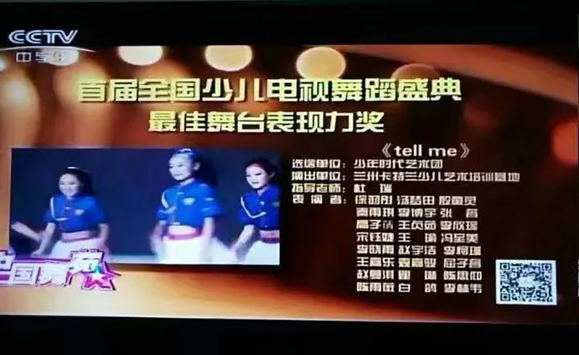 流行舞蹈《I don’t cdre》和《teII  me》荣获2015年中央电视台中学生频道举办的CCTV“首届全国少儿舞蹈盛典”比赛“最佳编导奖”和“最佳舞台表现力奖”