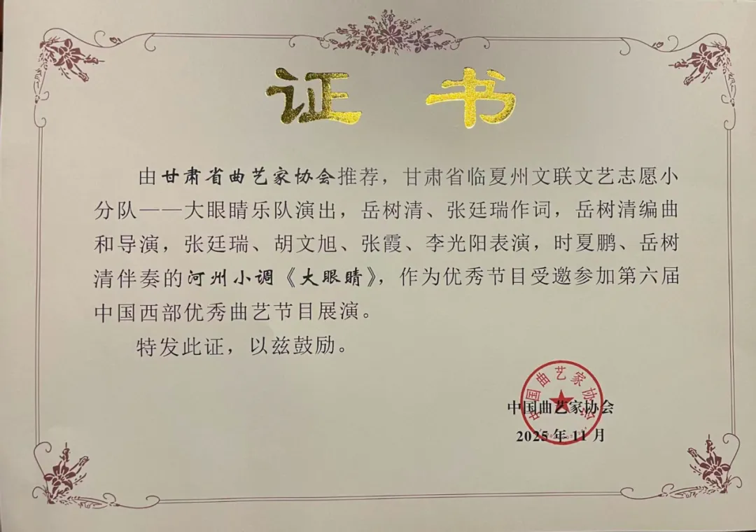 曲开巴山,艺向未来。11月11至14日,由中国曲协、四川省文联联合主办的第六届中国西部优秀曲艺节目展演活动在四川巴中成功举办。甘肃曲艺节目河州小调《大眼睛》和相声《中医趣谈》成功入选并精彩亮相此次西部曲艺盛会,展现陇原曲艺的独特魅力与时代风采。